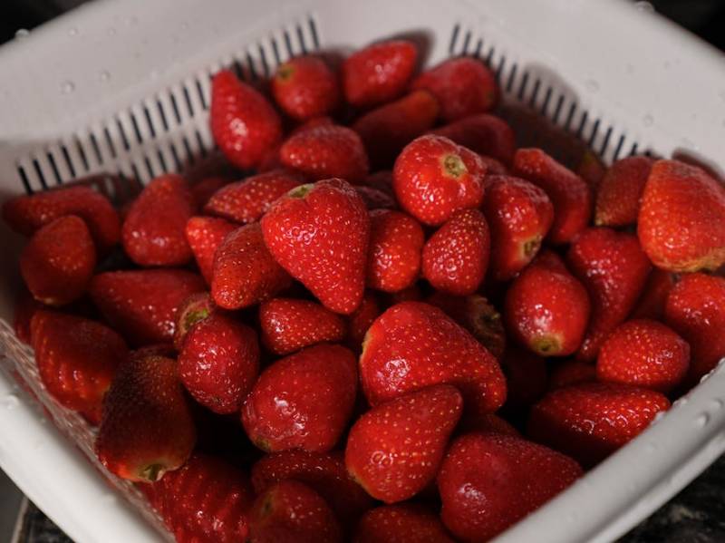 담근 후, 딸기를 체에 받쳐 찬물로 부드럽게 씻습니다. 물로 씻을 때는 딸기를 문지르지 않도록 주의해야 합니다.